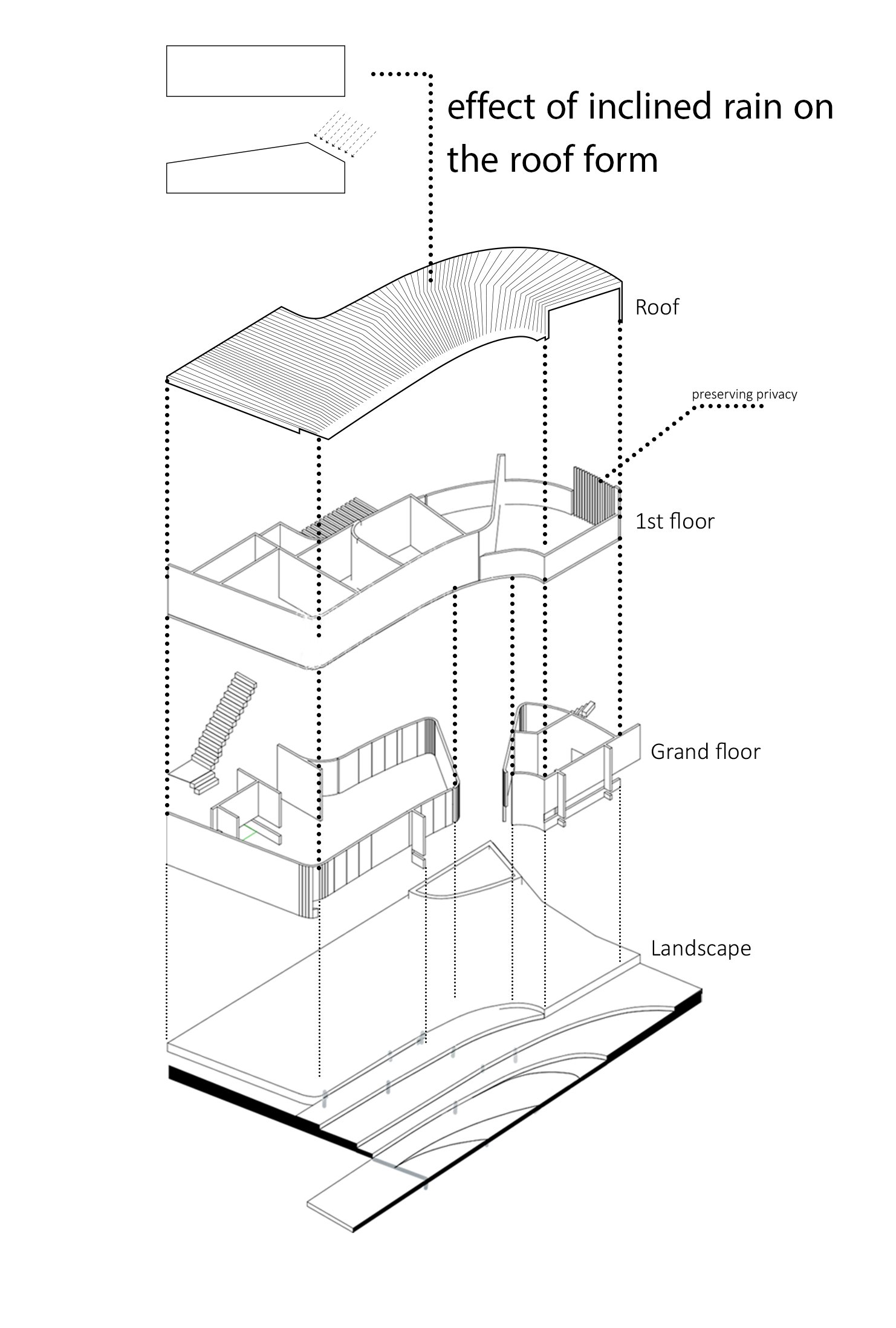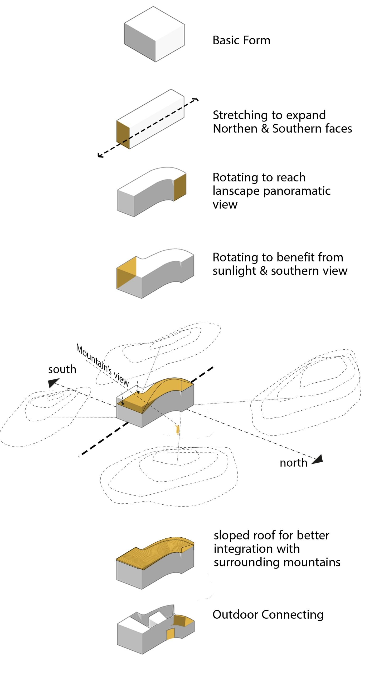 Considering the climate characteristics, landscape views, and prospective neighbor buildings, the villa concept was developed in an east-west orientation.