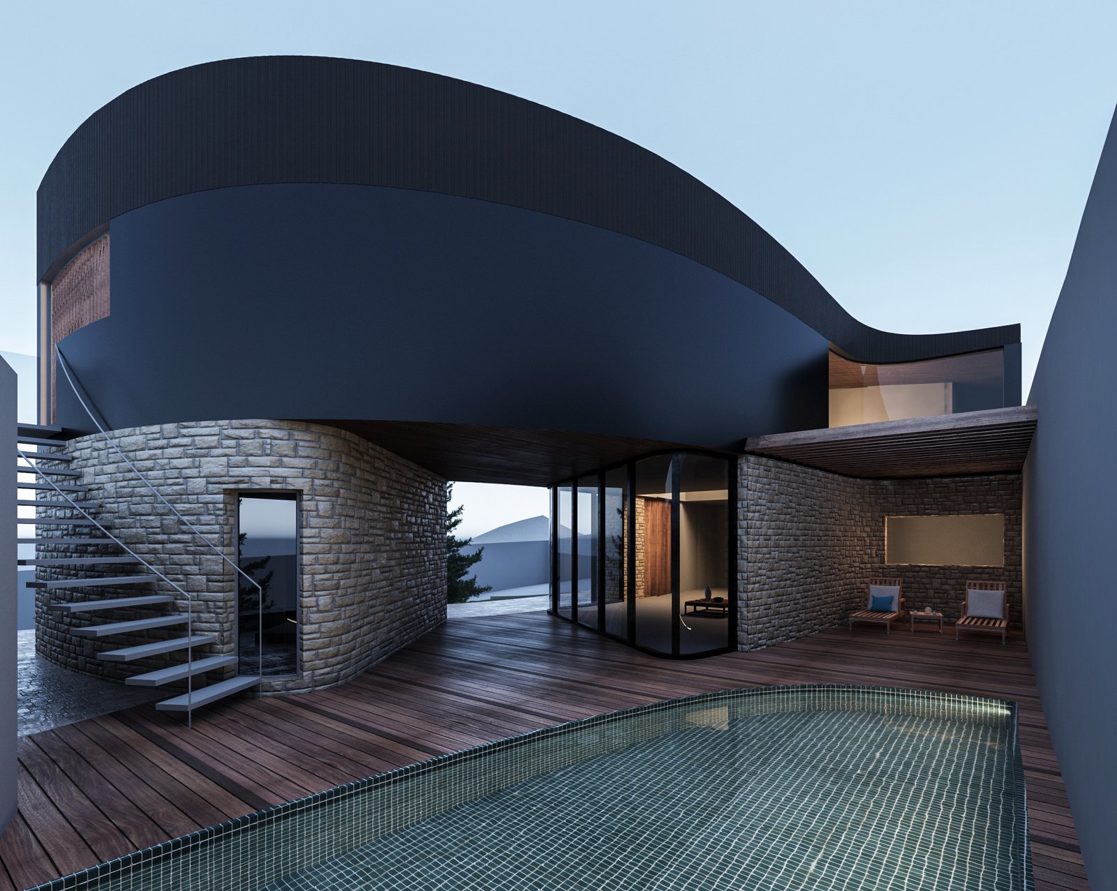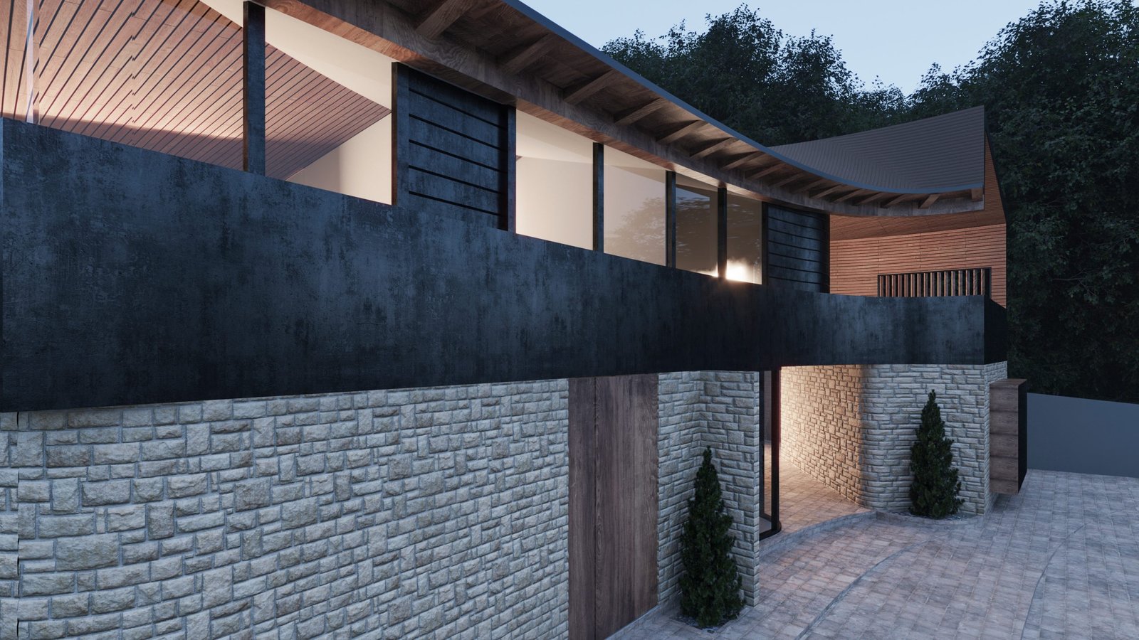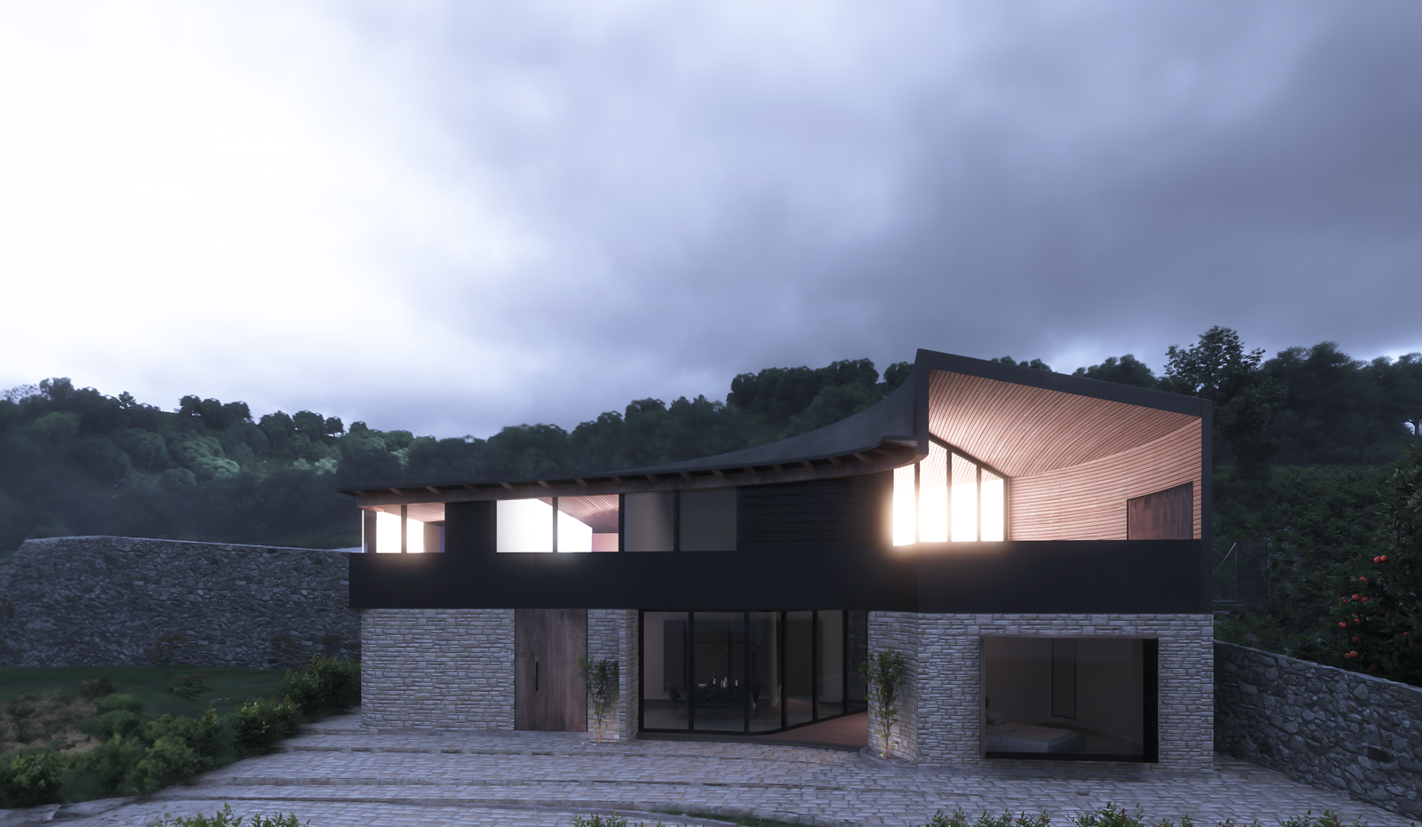 The idea is to establish a kind of dialectic between modernity and tradition by juxtaposing two different volumes that are different in terms of style, texture, and color. This is a critical action towards the villas that have been built in this area with classical-style. We intend to demonstrate the coexistence of modernity and tradition.