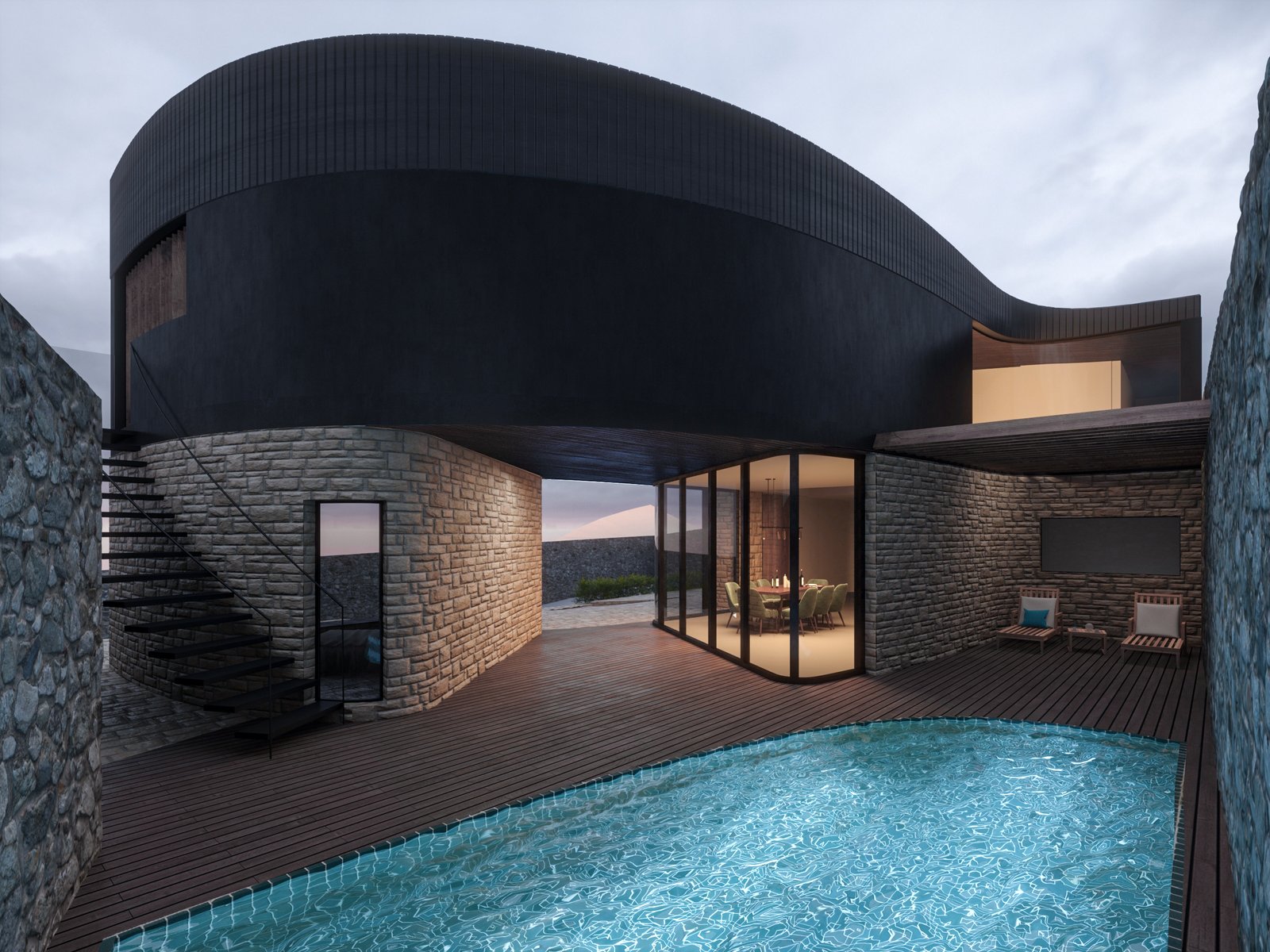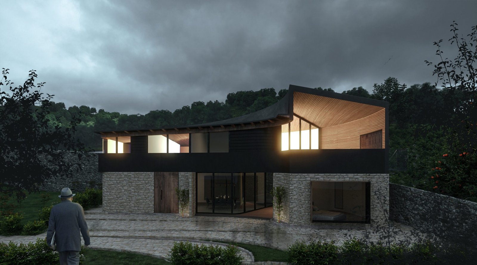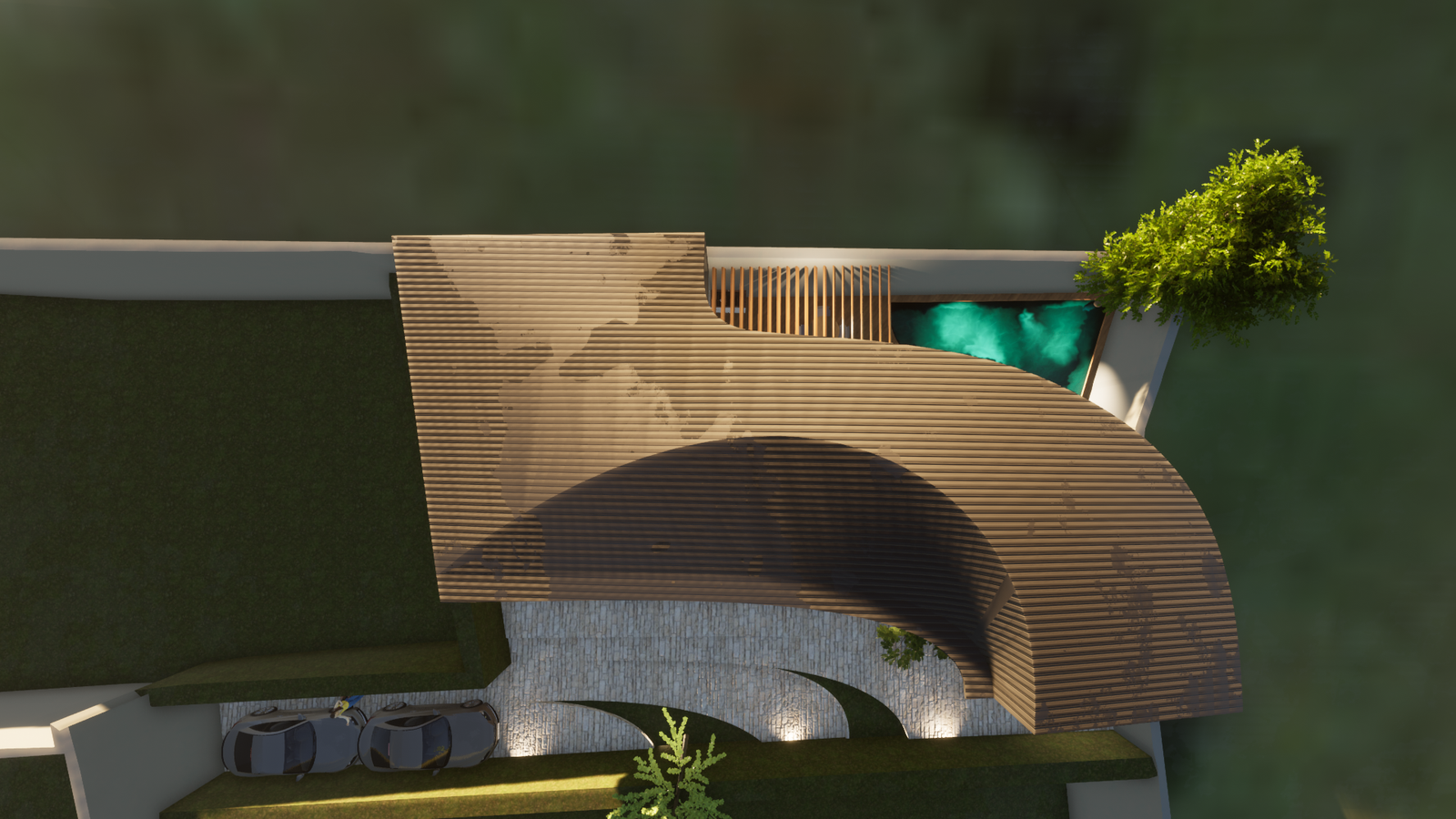 The idea is to establish a kind of dialectic between modernity and tradition by juxtaposing two different volumes that are different in terms of style, texture, and color. This is a critical action towards the villas that have been built in this area with classical-style. We intend to demonstrate the coexistence of modernity and tradition.